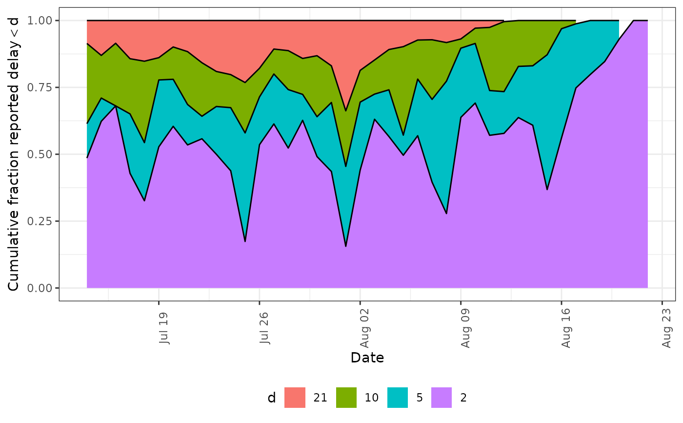 Stacked ribbon plot showing the cumulative fraction reported by delay group over reference dates.
